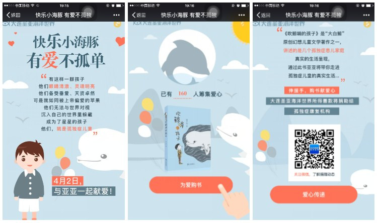 大连圣亚海洋世界--<快乐小海豚,有爱不孤单>微海报以爱心购书爱心传递的形式展开,设计上以清新的色系和卡通造型为统一基调,契合孤独症爱心事业的公益性质,页面配以扣人心弦的文案为辅,力求在第一时间吸引用户的注意力,使得用户对接下来的内容产生浓厚的兴趣及更想仔细了解活动的相关情况。最后展示购书的详细信息,引导用户顺利购书。活动的推出达成了品牌曝光以及粉丝的增长。
