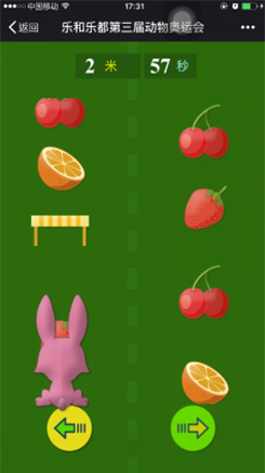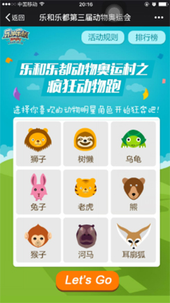 重庆乐和乐都疯狂动物跑微活动以动物奔跑躲避障碍物的趣味形式配上扁平化的动物形象设计进行,活动趣味十足。活动创意以奥运为话题展开,结合乐和乐都线下活动来进行,用动物代表来进行奥运会奔跑选拔赛,游戏设立排行榜单,排行榜单最高者可获得乐和乐都送出的奖励。