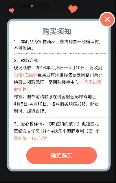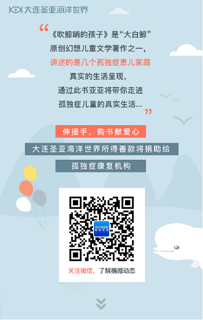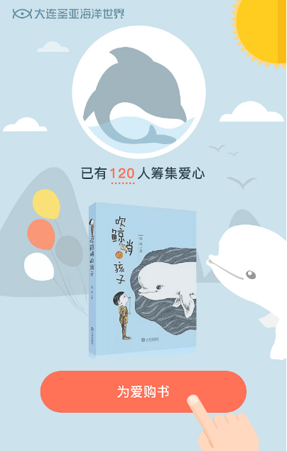 大连圣亚海洋世界为孤独自闭症爱心事业,与大连出版社合力推出众筹活动,用户可通过圣亚官网购买图书《吹鲸哨的孩子》,购书即可获得一个金属定制爱心书签,售书所得款全部用于孤独症爱心事业。活动的主要目的除了支持公益事业外,也是为了增加与粉丝的互动,唤起用户对景区的关注,以此引导促进销售。
