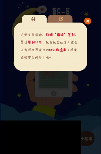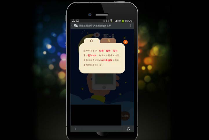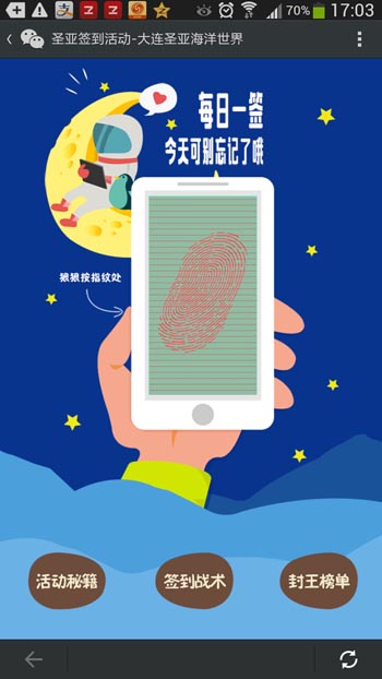 活动专题页面以简洁形象的方式呈现给用户,同时页面主题以指纹扫描的方式进行相关活动签到,参与形式上颇具新鲜感,这对主要的用户人群——大连本地学生更具有吸引力,通过形式的设置上在第一时间上提升用户的参与热情,更显人性化设计的重要性。