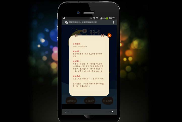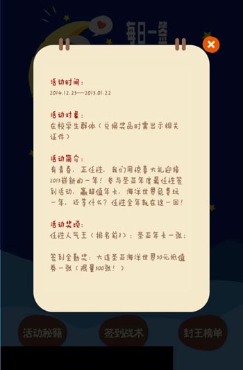 借助2015年元旦佳节来临之际,圣亚海洋世界品牌景区以节庆佳节为活动推广契机,品牌景区结合主要目标人群之一的大学生群体开展了基于微信移动平台的“大学生签到”活动,通过活动吸引目标人群关注,以优越的客户体验来提升用户对品牌景区观感,通过线上的活动推广带动线下票务的销售。