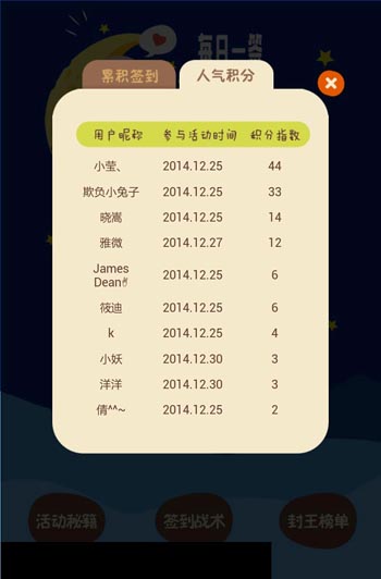分别为:活动秘籍、签到战术、封王榜单。区域划分明朗,用户可以根据个人情况来查看活动详情。
