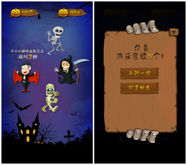 ②互动部分:抓鬼!屏幕闪现鬼怪(丧尸、女鬼、木乃伊、吸血鬼、僵尸等);