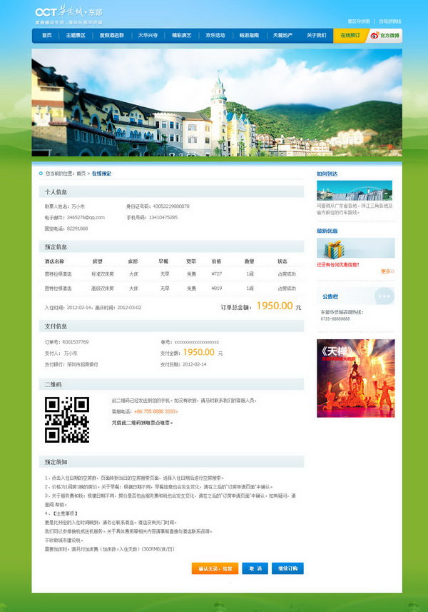 选择支付方式后,系统显示订单完整信息,提醒用户对订单进行最后确认并完成结算,该页面还附有订单二维码,用户须凭该二维码到景区取票处取票,至此,用户完成东部华侨城酒店预订整个过程
