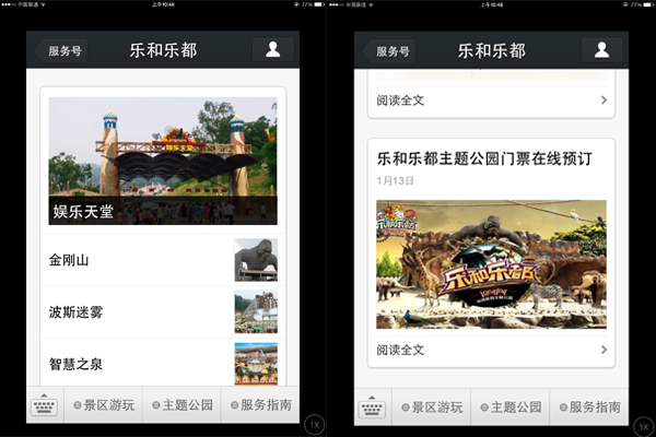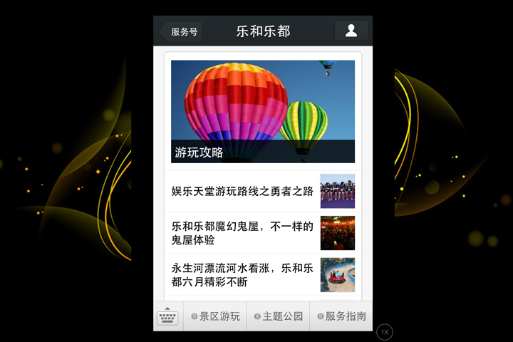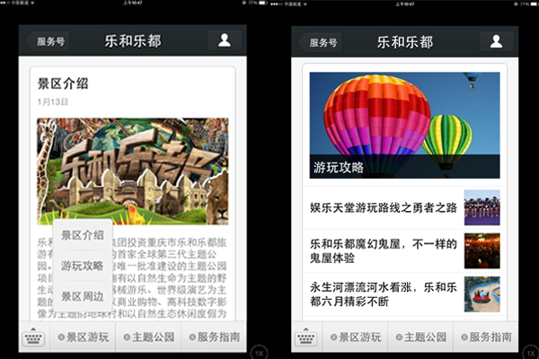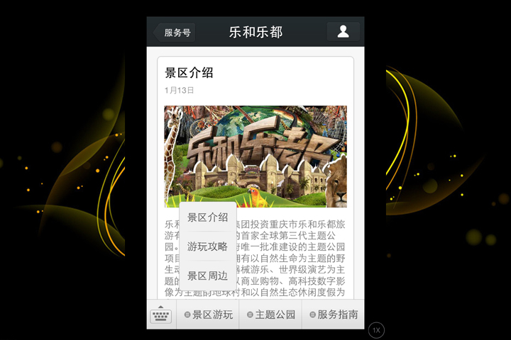 乐和乐都官方微信目前自定义菜单主要设有景区游玩、主题公园以及服务指南三部分,用户可根据自身需要,快速查询包括景区介绍、、游玩攻略、景区周边、景区活动、交通等在内的游玩信息