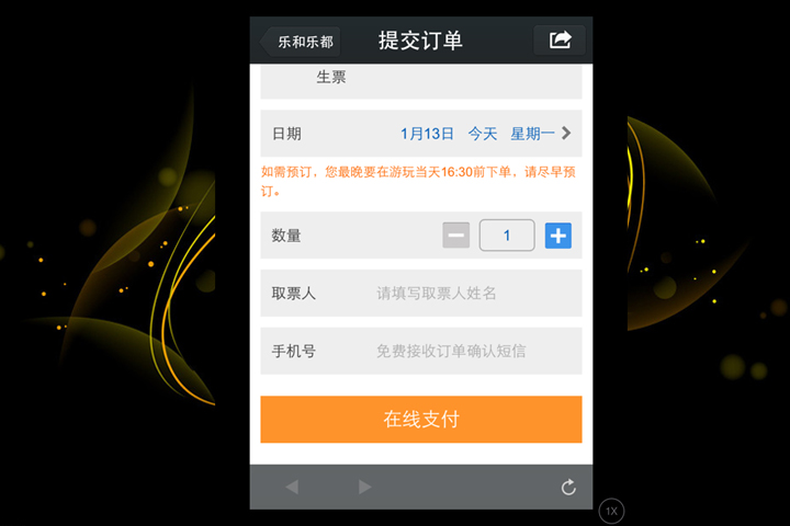 乐和乐都官方微信最大的亮点之一,是实现便捷的微支付功能。用户点击在线预订菜单进入景点详情页并填写订票数量、取票人、手机号码等信息,根据客户需求,用户提交订单后将进入同程网支付页面,完成交易