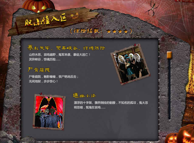 网页的导航栏划为首页、午夜惊魂界、胆小慎入区、狂欢PARTY“妖”约不断、返回官网,清晰明确的栏目划分,游客可以根据个人心理承受能力选择挑战项目。设计人性,页面动态感十足。