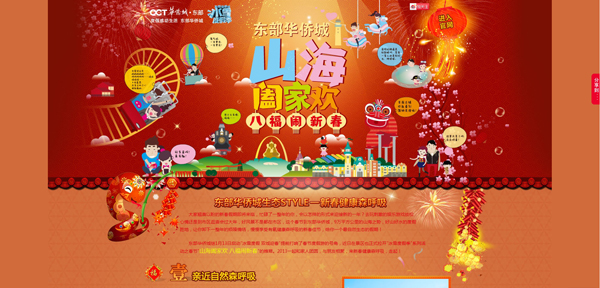 主视觉画面采用卡通画面的形式,通过运用大红灯笼、对联、炮竹、桃花、卡通生肖蛇以及Flash的烟花等春节元素,表现景区浓浓的年味气息,同时结合过山车、氦气球、温泉等景区景点代表元素,表现东部华侨城健康、生态、唯美的度假环境;