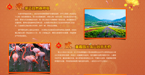 虽然是景区新春专题,但本站除主视觉画面采用传统喜庆红之外,分点内容采用的却是淡橘红色调,配合景区实景图展示,整体呈现出一种非常温馨、和谐的感觉。