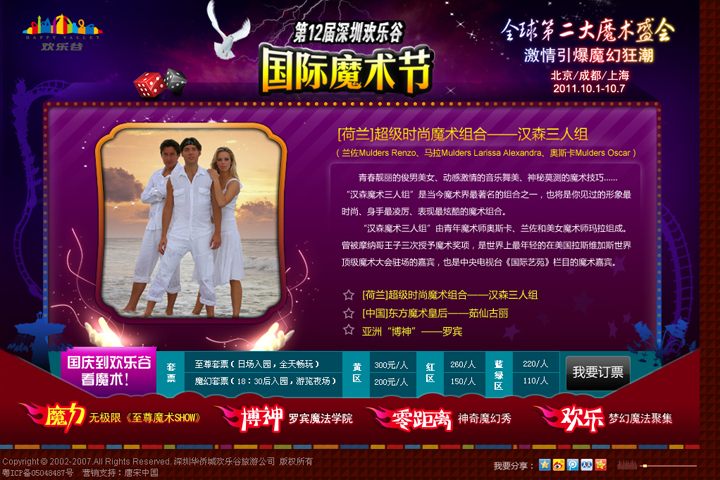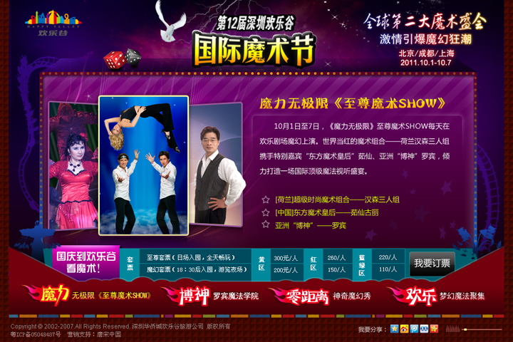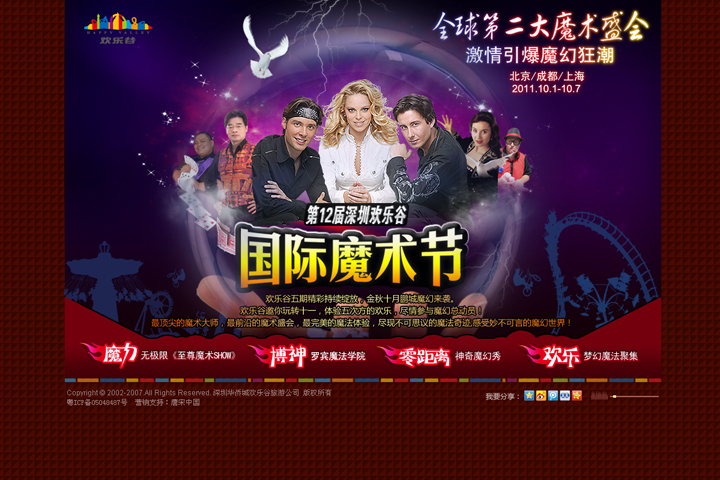 在国庆来临之际,欢乐谷特献上世界顶级魔术大餐!唐宋中国作为欢乐谷网站建设全年维护伙伴,专门制作了活动专题页面以配合此次活动的线 上线下宣传!