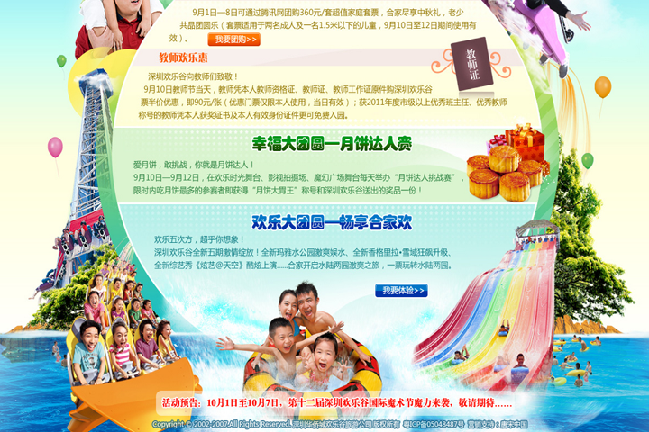 值中秋、教师节来临,从暑期结束后陷入短暂低迷的旅游主题公园又恢复了旅游旺季,旅游景区纷纷推出以中秋、教师节为中心的主题活动,唐宋中国做为欢乐谷的年度合作伙伴,及时为其制作了适合互联网上宣传的MINISITE旅游活动专题页面。并拟定了一系列营销推广计划。