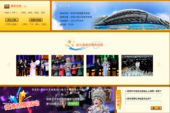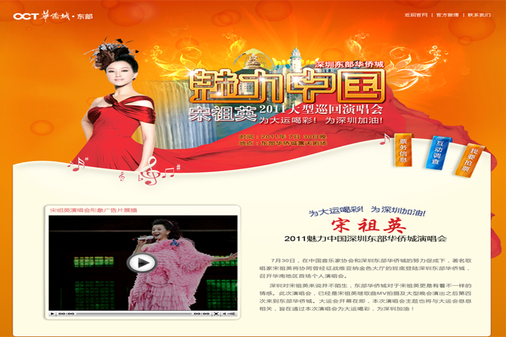 为大运喝彩、为深圳加油!宋祖英2011年魅力中国深圳东部华侨城演唱会,东部华侨城通过推广吸引到有效客户,有在线订票,同时充分运用网络与客户达成互动,从而形成良性循环。
