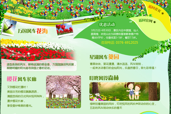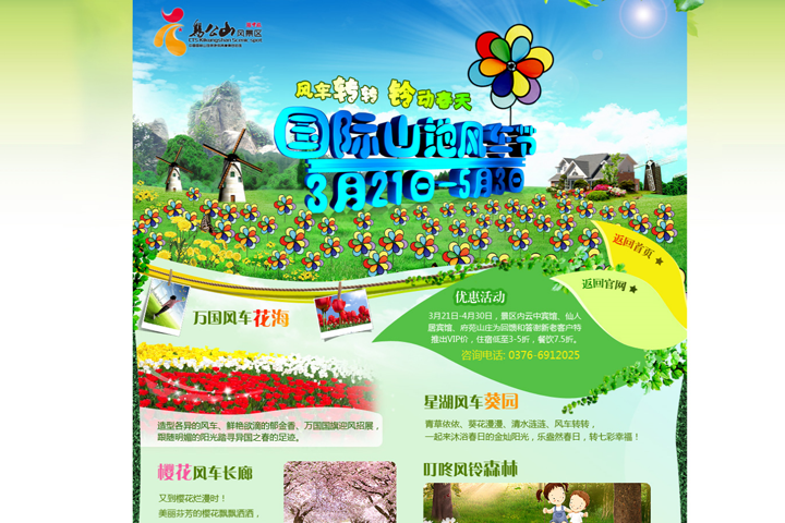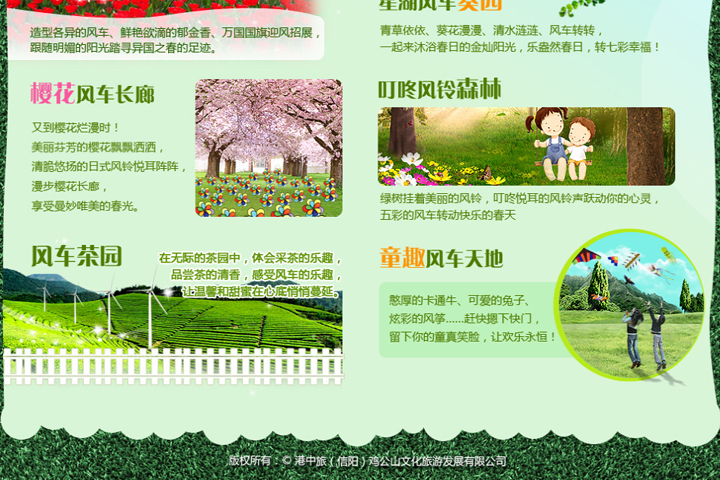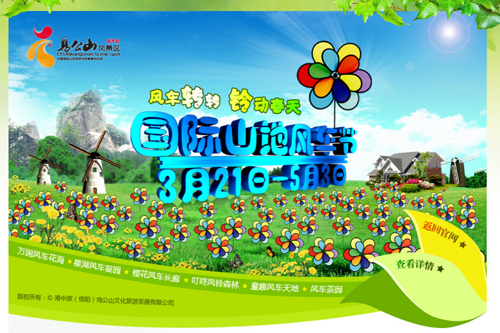 风车,在很多人心中,是童年软软的回忆,甜甜的,像一种情结,3月,正是花开的季节,在鸡公山溢着芳香的花海中,随风而起的是五彩的风车。让每个游览者仿若回到了童年的欢乐中!