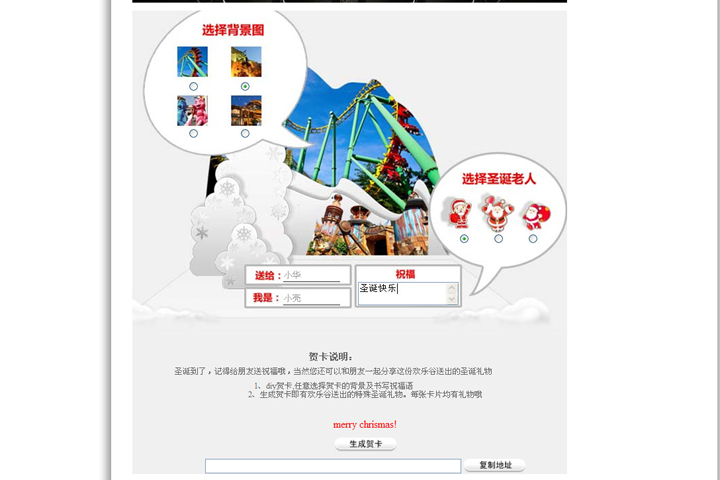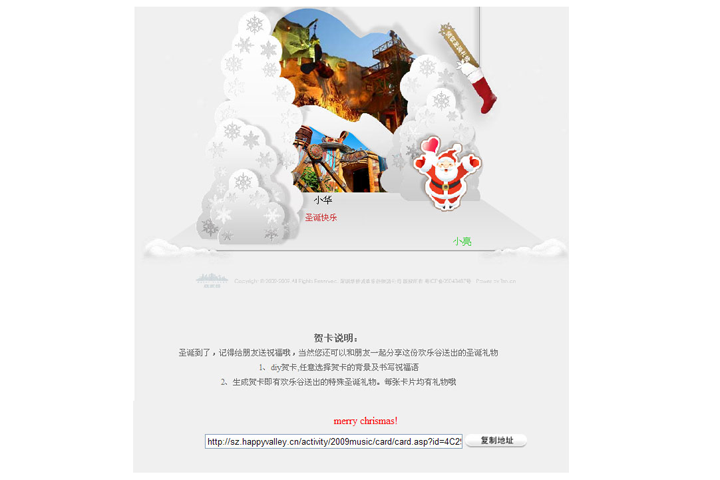为欢乐谷官网改造提供互联网品牌包装设计、整合营销、全年活动更新。 点击送祝福,送优惠。可以选择背景,选择圣诞老人,送出真诚的祝福生成美丽的贺卡。