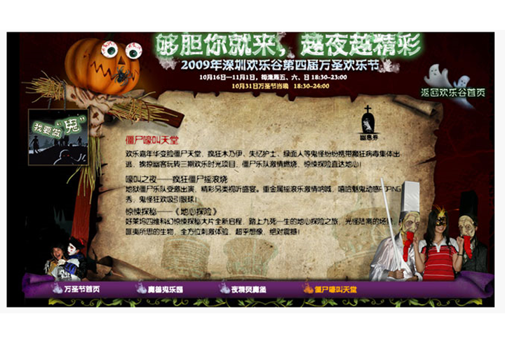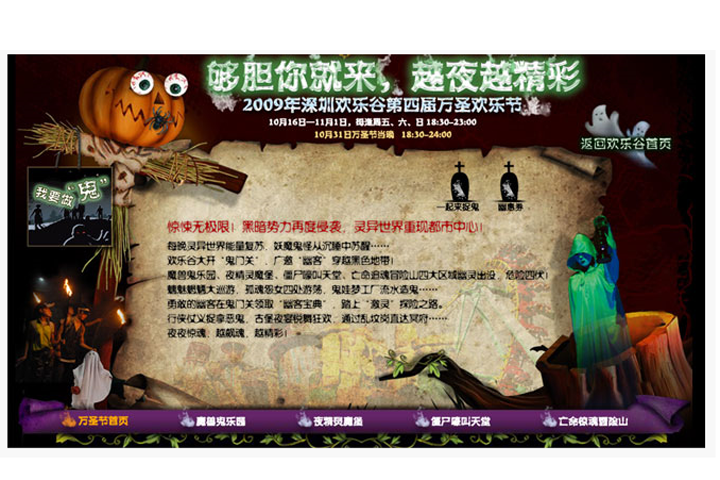 深圳欢乐谷是华侨城集团大型主题公园,每月都会有大型活动举行,要对每个主题活动做出专业,突出主题活动的网页页面设计。