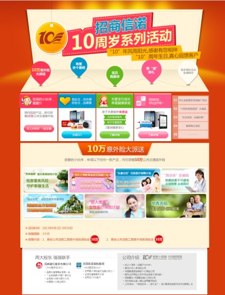 1、活动页面整体框架清晰简明,开头以一张打开的贺卡形式,突出十周年主典主题,各种活动贺礼以缤纷彩球形式呈现,无处不体现出喜庆、欢乐的节庆气氛,整个页面整简洁大气,富有趣味