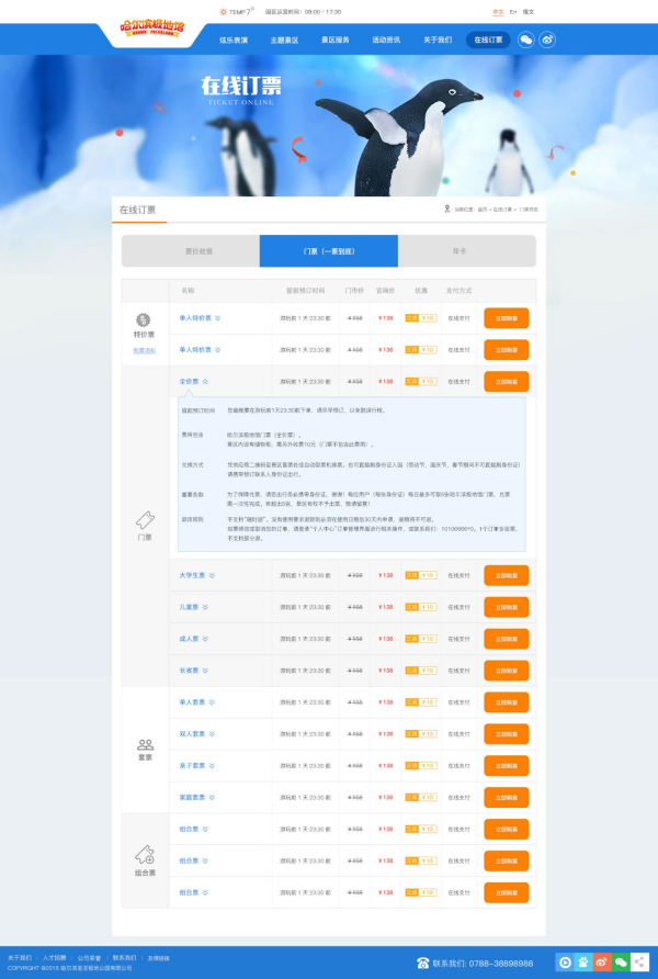 4.已成功实现官网预订门票及年卡功能并支持支付宝、银联、微信支付在线支付。票种展示直观大气。操作流程简便。