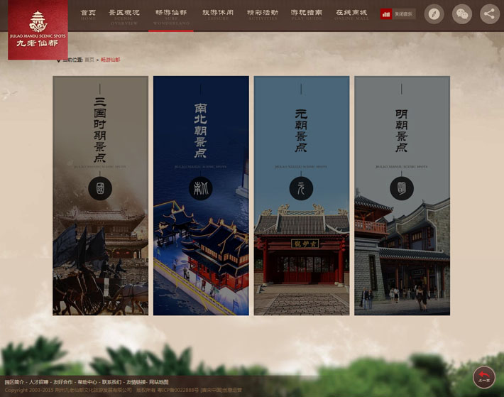 九老仙都景区作为一个刚新建的景区,迫切需要一个非常好的品牌形象,在项目启动之前唐宋中国与客户进行了深入沟通,了解透彻景区的特色、品牌需求、市场定位、针对人群。在新时代的品牌塑造中通过五大板块画面呈现景区独特魅力,更好的突出了九老仙都景区的独有特色,每幅画面加入部分动态元素,让大家感受不同时期的历史文明,更加产生到访欲望。不仅设计和图片丰富游客的眼球,而且各级菜单及侧面菜单灵活好用。