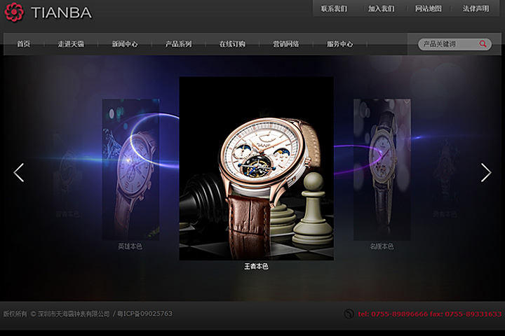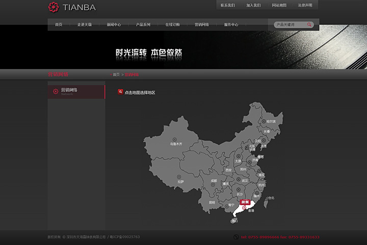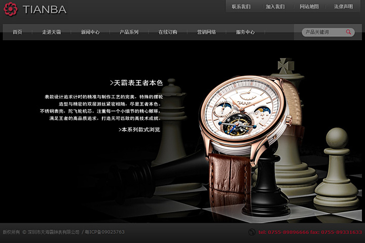 体现出天覇品牌的力量与霸气,用色强烈,使用重色背景,视觉上给人一种专业厚重的技术力量感。Flash展示产品,突显产品的大气,品牌的动感,给予浏览者良好的视觉体验。提供在线订购功能,向电子商务趋势靠拢,营销网络直观展示出天霸表的渠道优势,突显品牌实力