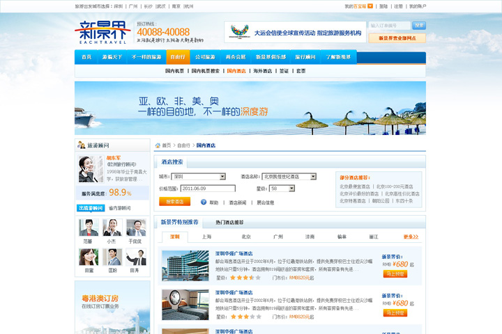 新版网站的界面设计非常大气,充份展示了新景界的品牌实力。针对不同的目标人群,规划了游遍天下、不一样的旅游、自由行、公司旅游、商务会展等栏目。