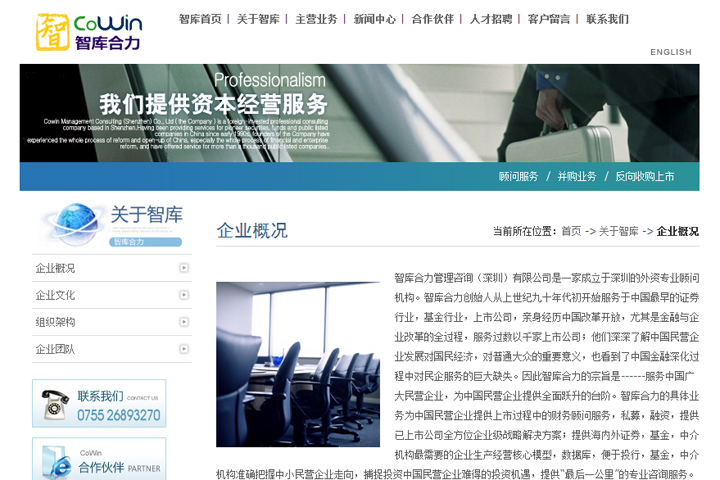 智库合力管理咨询(深圳)有限公司是一家成立于深圳的外资专业顾问机构。智库合力创始人从上世纪九十年代初开始服务于中国最早的证券行业,基金行业,上市公司,亲身经历中国改革开放,尤其是金融与企业改革的全过程,服务过数以千家上市公司;他们深深了解中国民营企业发展对国民经济,对普通大众的重要意义,也看到了中国金融深化过程中对民企服务的巨大缺失。