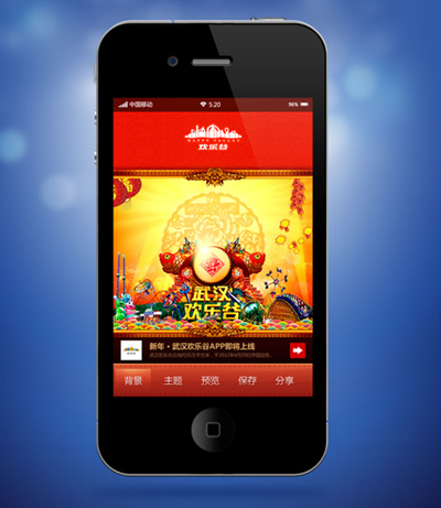 “新年•武汉欢乐谷”这款APP最大的亮点在于,它是根据单个活动主题进行独立制作的,抛开了其他旅游景区APP以大量枯燥、实用性信息为主的风格,唐宋中国开发团队将应用的侧重点放于生动的用户趣味DIY体验上,通过引导用户动手操作,慢慢将其转化为潜在客户,从而达到品牌营销目的。当用户在兴致勃勃地给自己手机搭配各种主题背景或将精美桌面分享给好友时,已经不知不觉陷入我们的品牌营销圈套了。