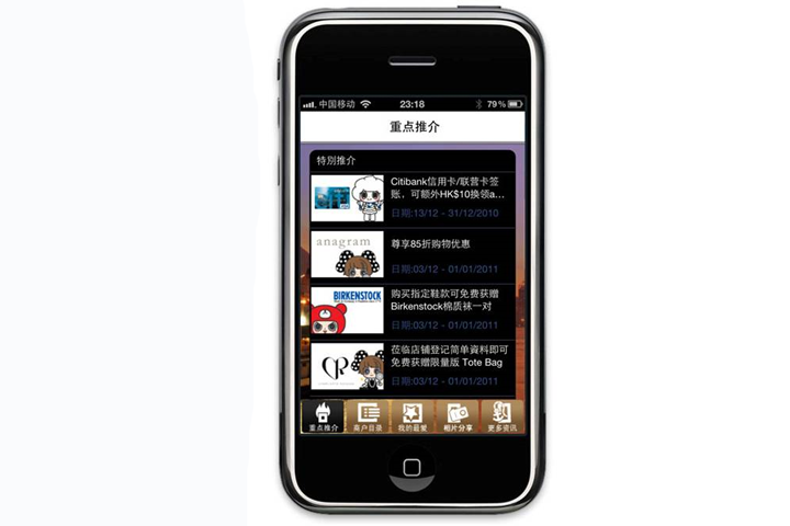 软件平台可搜寻商场内商户及食肆,有详细说明和产品展示,并可对商场活动及促销活动进行分享和推广。